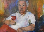 2015Man zit ontspannen met een glas sap of wijn in zijn hand.