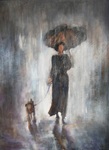 2014Vrouw moet in stromende regen de hond uitlaten.